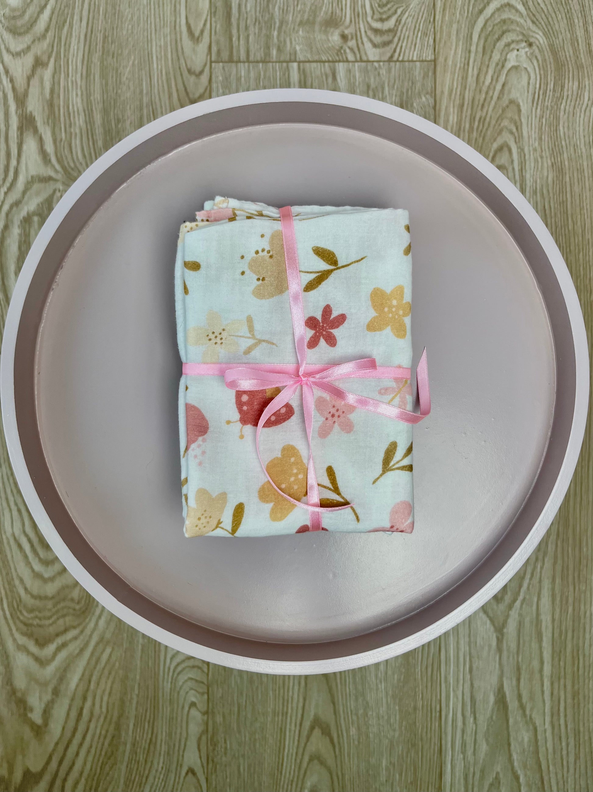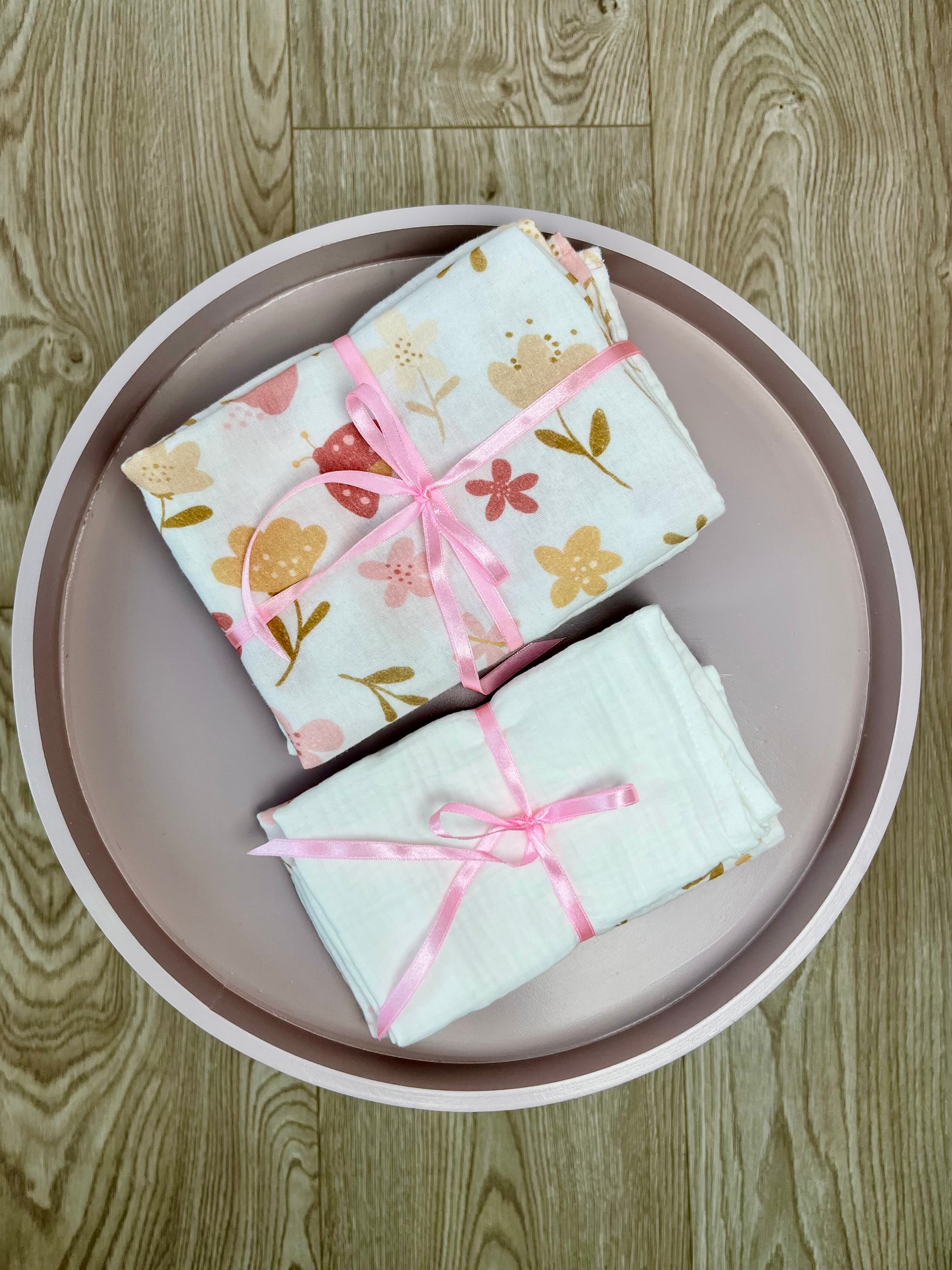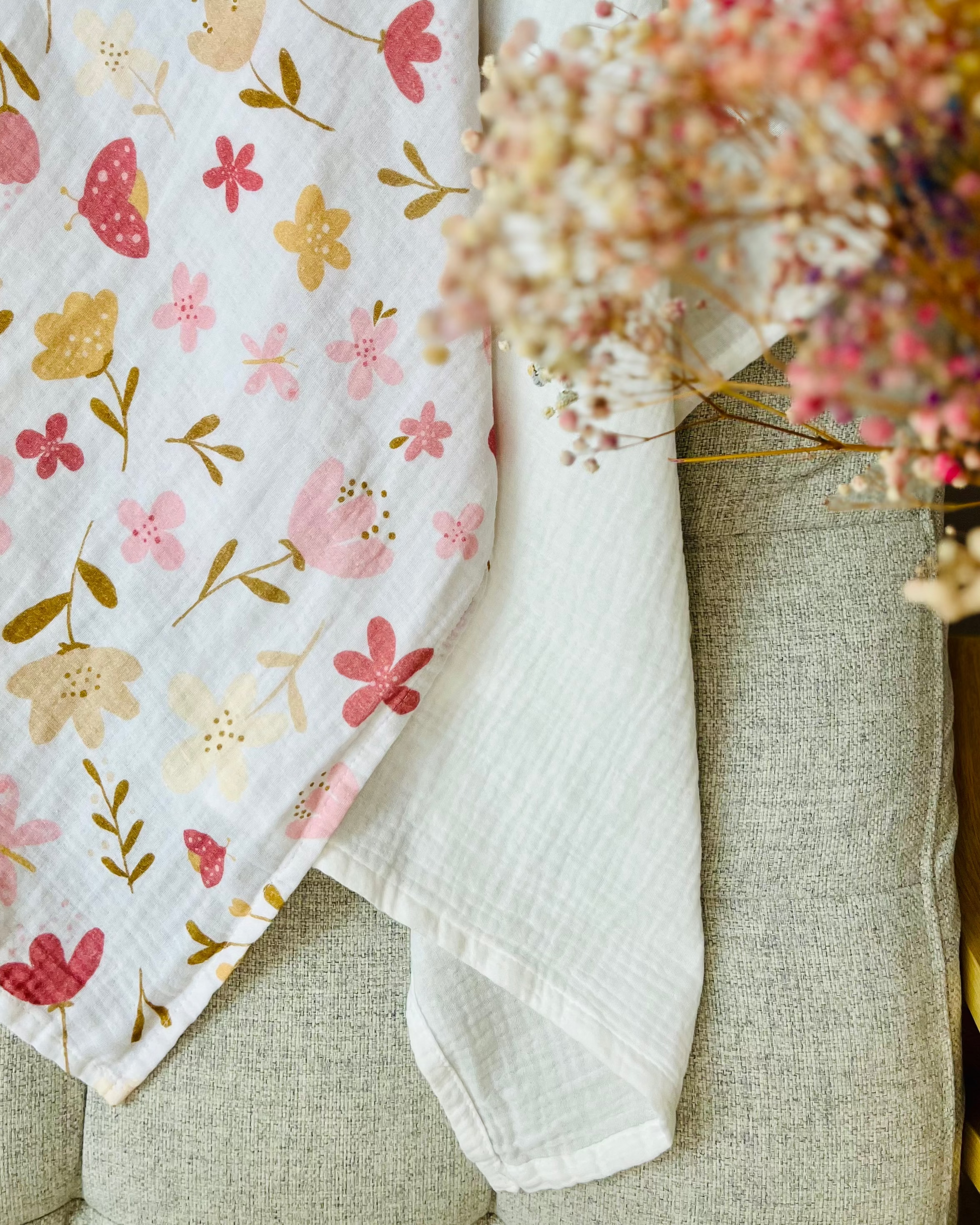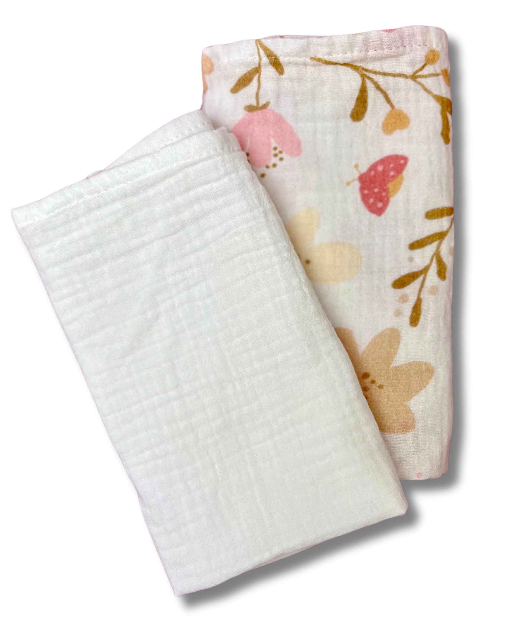 Każdy zestaw zawiera dwie pieluszki: jedną w kolorze mlecznej bieli oraz drugą z delikatnym wzorem łąki.