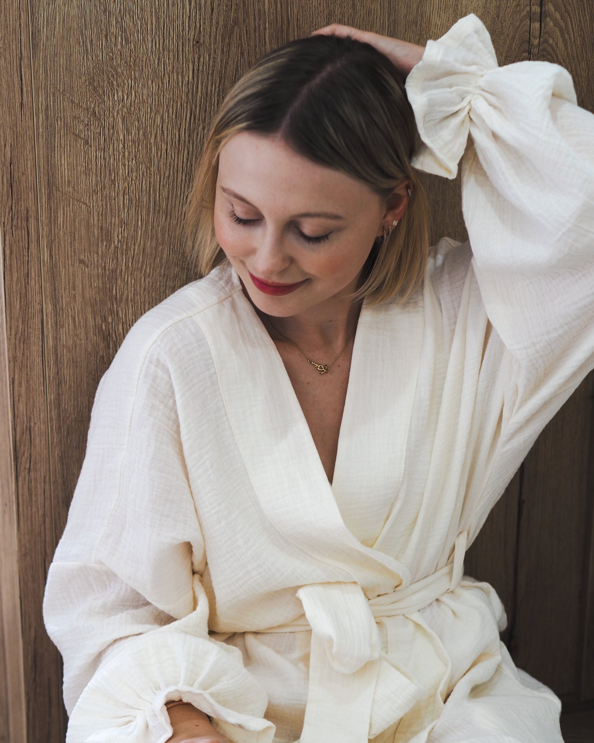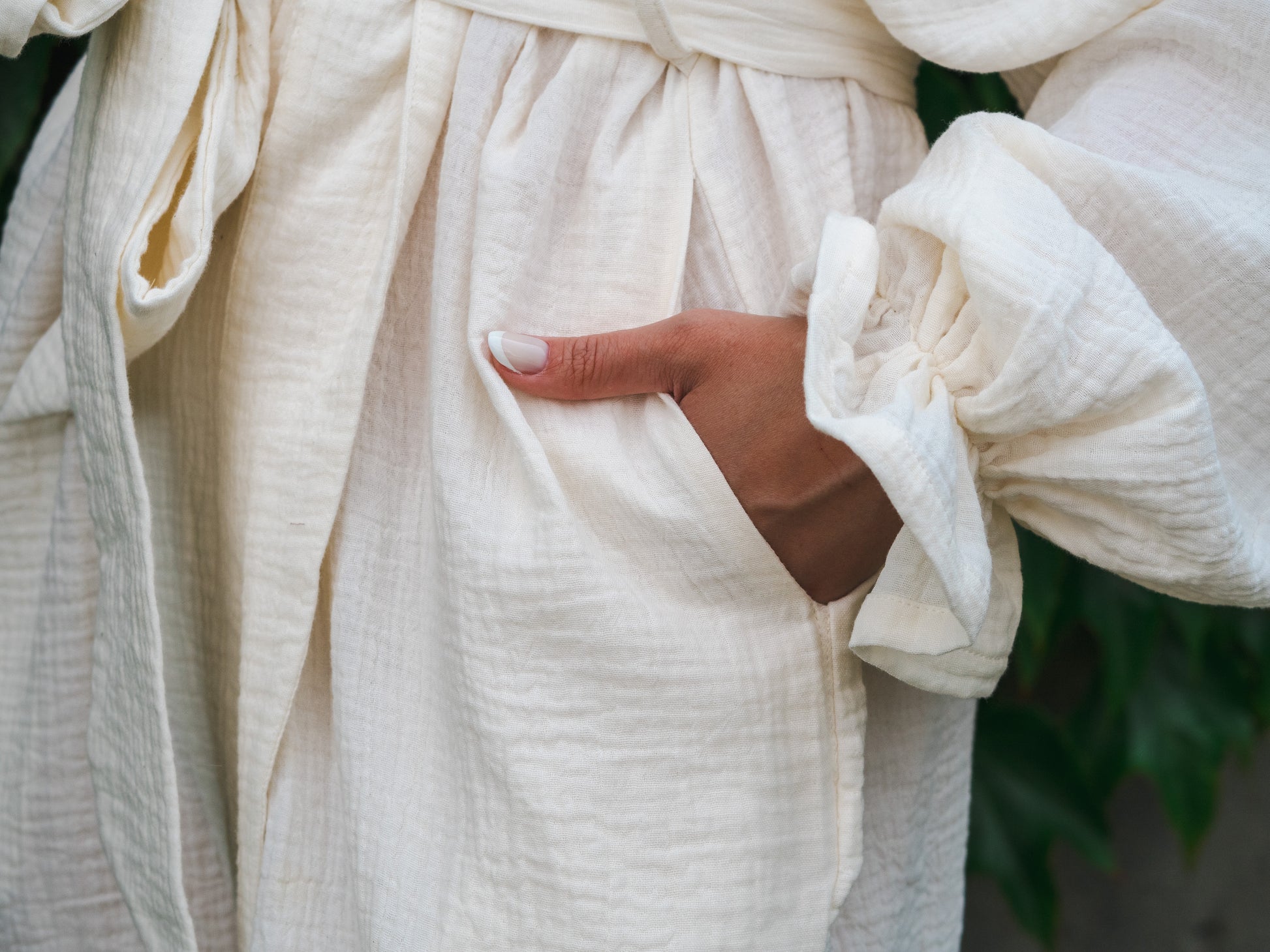 Otul się miękkością, której nie chce się zdejmować. Nasz szlafrok z wysokiej jakości, oddychającego muślinu bawełnianego to połączenie lekkości, komfortu i naturalnej elegancji. Uszyty z myślą o codziennym rytuale spokoju — od porannych chwil z kawą po wieczorne wyciszenie.